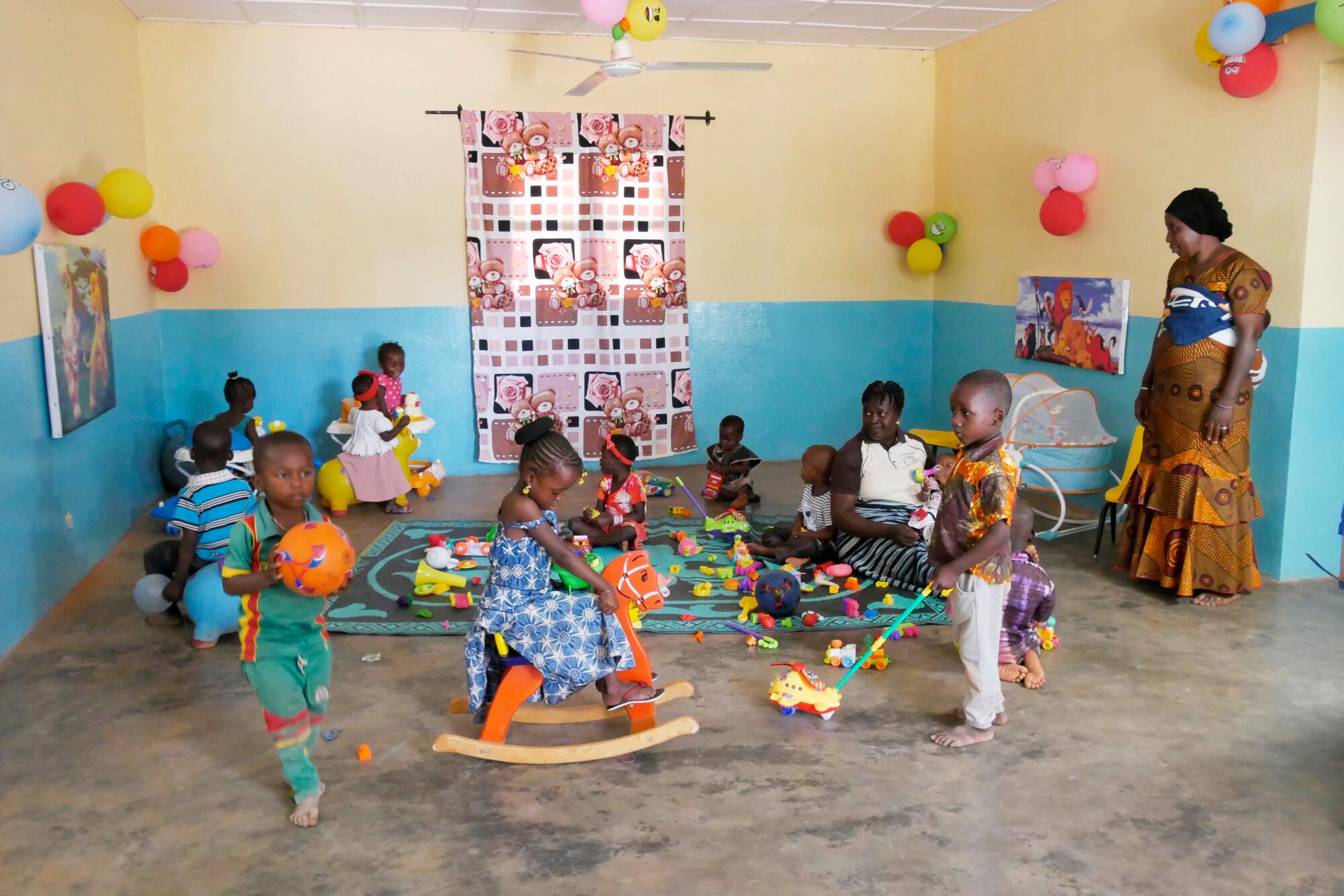 Cerca de sus hijos que se divierten en la guardería, mientras sus madres trabajan en un edificio cercano. Tanto si se trata de jefes de equipo de clasificación como de operarios de prensado o de mantecado, pueden hacerlo con toda tranquilidad. Pueden trabajar con confianza sabiendo que sus hijos están bien atendidos por las dos niñeras que cuidan de la guardería. En una región agrícola como Toussiana, las estructuras que permiten a las madres jóvenes con hijos pequeños seguir trabajando son casi inexistentes.
