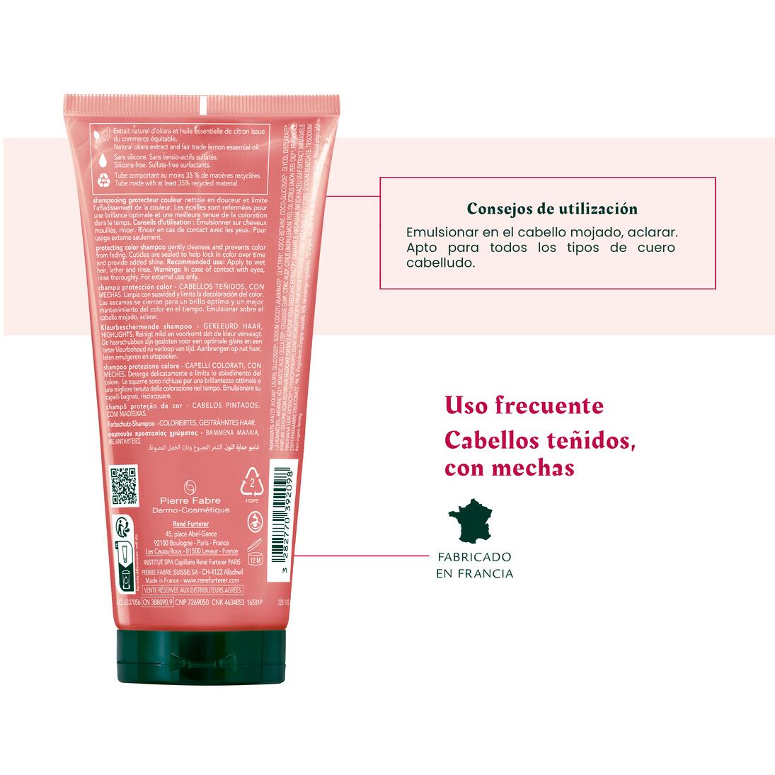 Este champú profesional para cabellos teñidos o con mechas limpia suavemente el cabello y preserva la intensidad del color. Su fórmula protectora, enriquecida con activos naturales expertos, combina los beneficios de los aminoácidos del extracto natural de Okara orgánico, similares a los de la queratina, el extracto de Hamamelis orgánico, un potente fijador del color de origen vegetal, y el aceite esencial de limón orgánico, antioxidante. Fija el pigmento en el corazón de la fibra capilar y cierra las escamas para aportar un brillo óptimo y un color más duradero. Su textura ultrasensorial, con una deliciosa fragancia floral, se transforma en una emulsión cremosa. El cabello recupera su flexibilidad y brillo, y el color es intenso y duradero.