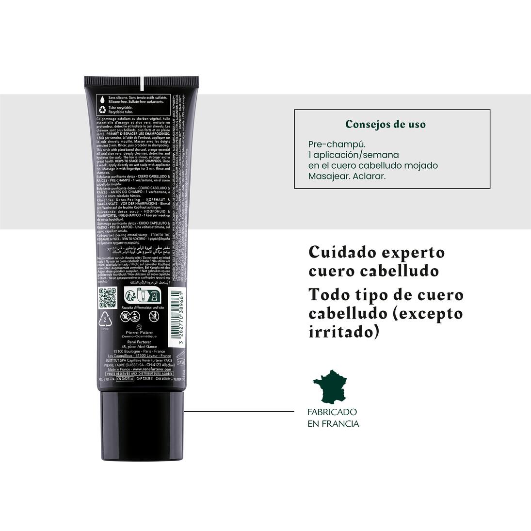 Este cuidado detox pre-champú con una fórmula 99% de origen natural limpia el cuero cabelludo en profundidad y elimina el exceso de sebo en 3 minutos, para recuperar un cabello sano. Formulado con aloe vera y enriquecido con sal marina de Guérande, carbón vegetal y aceite esencial de naranja BIO, este exfoliante purificante ofrece una verdadera cura detoxificante al cuero cabelludo a la vez que le aporta hidratación. Su textura exfoliante fundente con perfume natural se transforma en una espuma ligera y fácil de aclarar durante el masaje. Utilizar una vez a la semana para eliminar las impurezas rebeldes y destapar los poros del cuero cabelludo. El cabello está más bonito, más fuerte y no se engrasa tan rápidamente. Reservado para adultos y adolescentes a partir de 15 años.