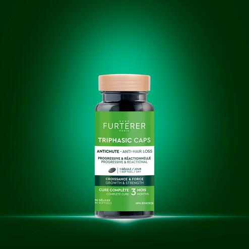 TRIPHASIC CAPS Antiqueda suplemento alimentar ajuda a restaurar os nutrientes essenciais ao cabelo para níveis normais, abranda a queda de cabelo e estimula o crescimento capilar com extrato de cavalinha.