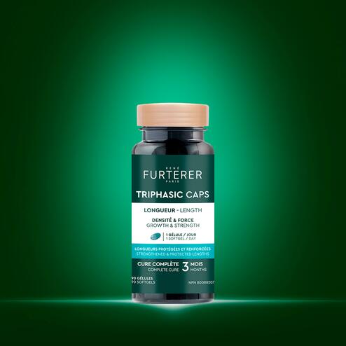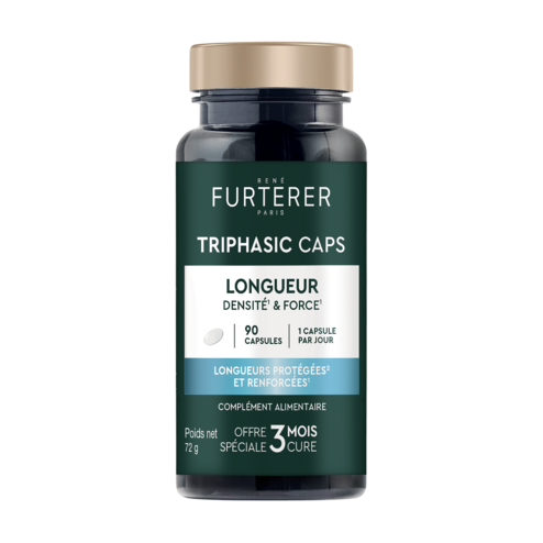 TRIPHASIC CAPS Comprimento, suplemento alimentar, especialmente concebido para cabelo comprido. A sua fórmula enriquecida com vitaminas proporciona densidade* e reforça a beleza de um cabelo comprido. Os comprimentos são reforçados* e protegidos graças à vitamina E, que ajuda na proteção celular contra o stress oxidativo. Sem colorantes artificiais.